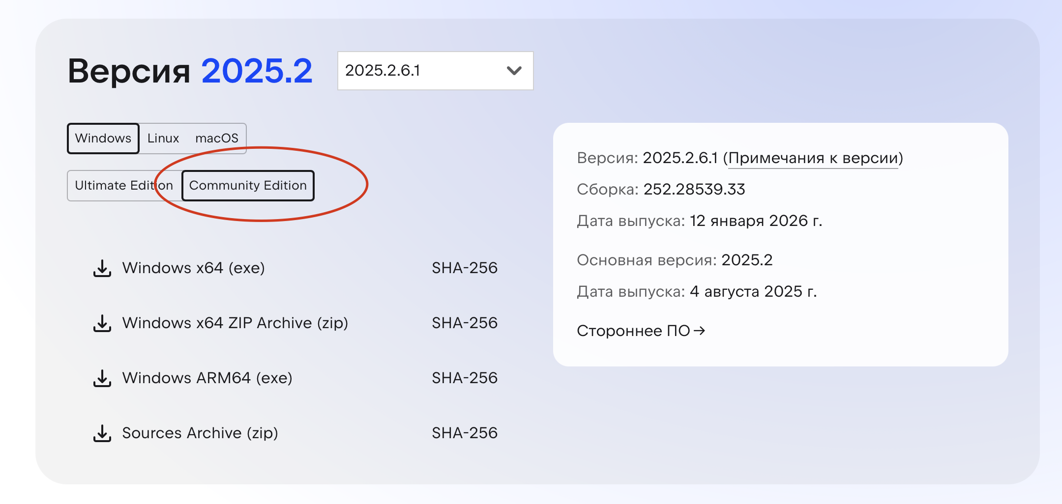 Чтобы найти Community версию нужно перейти на специальную страницу, где доступны все версии и найти там Community версию